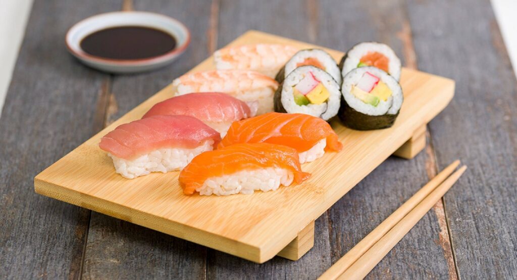 Peștele era sărat și ambalat în orez fiert. Prin fermentarea acidului lactic, orezul căpăta un gust de oțet și păstra peștele. Când era servit peștele, orezul era aruncat. În anii 1400, japonezii au început să mănânce și orezul. În perioada Edo, feliile de pește proaspăt au început să fie servite cu mici grămăjoare de orez cu oțet, condimentat uneori cu wasabi. De asemenea, sunt consumate alge marine: kelp, wakame, agar-agar (alge roșii), alge uscate nori – foițele în care se învelește sushi.