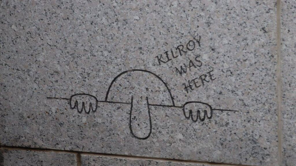 Din când în când, în zilele noastre, pe clădiri apar graffiti cu un tip chel cu nasul lung care se uită peste un perete, adesea cu legenda „KILROY WAS HERE”. Este un omagiu modern adus unei meme virale din anii 1940, care a străbătut globul în timpul celui de-Al Doilea Război Mondial și a apărut oriunde erau militari americani. A devenit un fel de competiție pentru GI să încerce să eticheteze cele mai obscure, mai îndepărtate și mai ciudate locații cu imaginea și textul „Kilroy a fost aici”. Expresia și desenul erau văzute în băi, barăci, cantine, corturi, calele navelor Marinei, ruinele clădirilor distruse, sculptate pe trunchiuri de copaci și aproape pe orice suprafață care putea fi vopsită sau mâzgălită cu cretă.