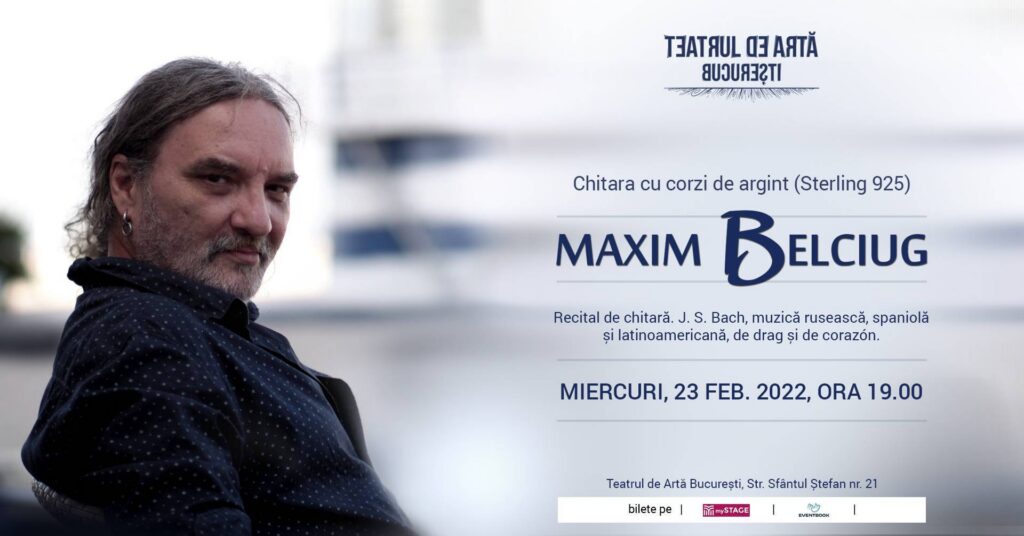 Miercuri, 23 februarie, carismaticul chitarist Maxim Belciug susține primul recital solo din 2022 pe scena Teatrului de Artă București. Intitulat sugestiv „Chitara cu corzi de argint”, recitalul promite o metaforă-bijuterie de desfătat auzul și inima, cum nu se poate mai nimerită pentru o seară ante-dragobete. Iar cum protagonistul serii este Maxim Belciug, artistul chitarei și al Încântărilor, e sigur că norocoșii ce se vor afla în sală vor petrece un răstimp prețios, sclipitor ca spuma mării, legănați de J. S. Bach, cu muzică rusească, spaniolă și latinoamericană, de drag și de corazón. Așa sună iubirea, aceea mirabilă, cu gust de primăvară albastră, care s-a făcut muzică și vine câteodată să ne tresalte și pe noi.