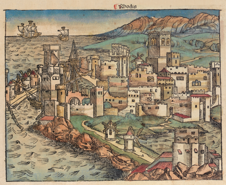 Din cele mai vechi timpuri, mica insulă grecească Rhodos a fost o intersecție principală între Marea Egee și Marea Mediterană, și a fost un important centru economic în lumea antică. Capitala, numită și Rhodos, a fost construită în 408 î.Hr. și a fost proiectată pentru a profita de cel mai bun port natural al insulei de pe coasta de nord. În 357 î.Hr. insula a fost cucerită de Mausolus de Halicarnassus, dar a căzut în mâinile persane în 340 î.Hr. și a fost în cele din urmă capturată de Alexandru cel Mare în 332 î.Hr.