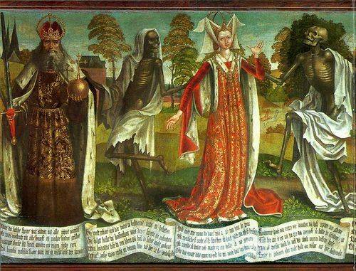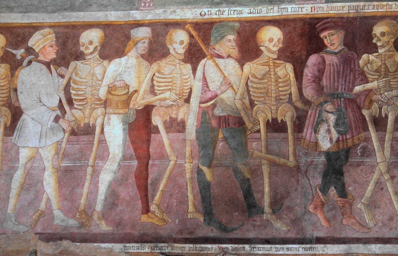 Unul dintre cele mai populare subiecte murale este Dansul Morții : peste 100 de picturi murale ale temei, precum și zeci de manuscrise aurite, au fost identificate în Anglia, Estonia, Franța, Germania, Italia, Spania și Elveția. Picturile murale “Dance of Death” reprezintă cadavre în descompunere dansând în mijlocul figurilor reprezentative ale societății medievale târzii, clasate de la cel mai înalt nivel: un papă, un împărat, un episcop, un rege, un cardinal, un cavaler și până la un cerșetor.
