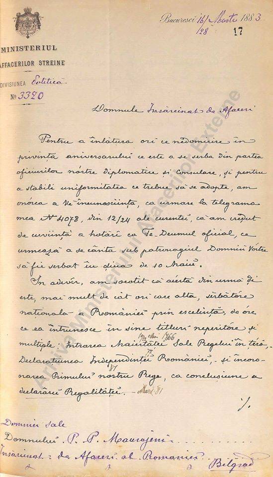 Bunăoară, în 1883, Ministerul Afacerilor Străine emitea o circulară către toate misiunile diplomatice și oficiile consulare ale României în care menționa că 10 Mai este „sărbătoarea națională a României prin excelență deoarece întrunește în sine titluri nepieritoare: Intrarea Majestății Sale în țară (10/22 mai 1866), Declararea Independenței României (1877), și încoronarea primului nostru Rege (1881)”, misiunile având obligația să respecte această dată ca singura zi de sărbătoare oficială.