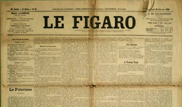 Apariția Manifestului Futurist într-un cotidian, a fost o altă noutate, iar autorul său, Filippo Tommaso Marinetti, a evitat publicațiile artistice pentru o mass-media cu multi cititori. Apărând pe prima pagină a ziarului francez Le Figaro, pe 20 februarie 1909, a creat repercusiuni care s-au simțit de-a lungul secolului 20.