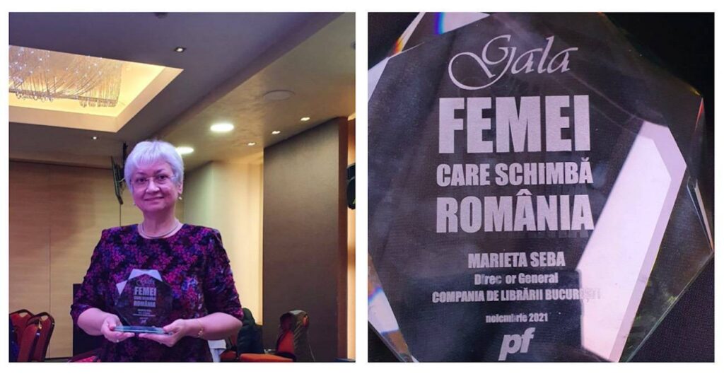 La finalul săptămânii trecute, Marieta Seba, directoarea generală a Companiei de Librării București, a fost premiată în cadrul Galei „Femei care Schimbă România”, un eveniment dedicat excelenței feminine în lumea businessului, organizat de FIN Media, cu sprijinul revistei Piața Financiară.