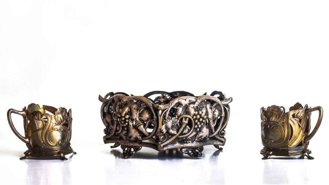 Suportul pentru pahar aparține secolului XX și este decorat cu motive florale, fiind realizat la Wurttembergische Metallwarenfabrik, o fabrică a cărei activitate a început în 1853, în Geislingen, un mic oraș german, și care continuă până astăzi, se precizează pe pagina de Facebook a muzeului.