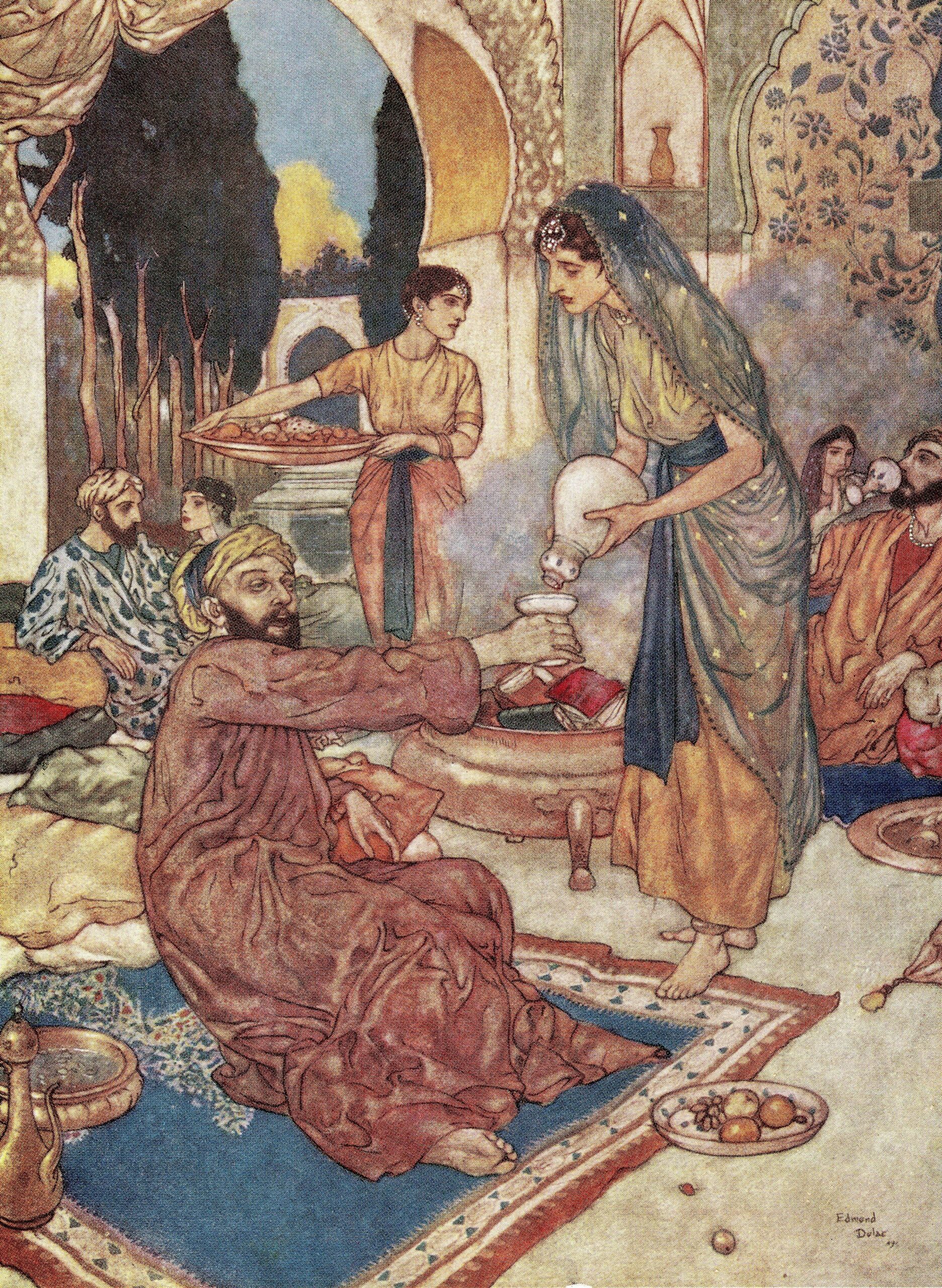 O poveste destul de interesantă este furnizată de Edward FitzGerald în prefața traducerii. Potrivit sursei citate, în perioada în care Omar a fost acceptat de Imam Mowaffak ca student al său, renumitul savant a luat pe alți doi studenți – Nizam al-Mulk , și Hassan-i-Sabah. În timp ce studiau sub comanda lui Imam Mowaffak, cei trei au devenit buni prieteni și au jurat că, în cazul în care unul dintre ei va avea succes mai târziu în viață, își va împărți averea în mod egal cu ceilalți doi.
