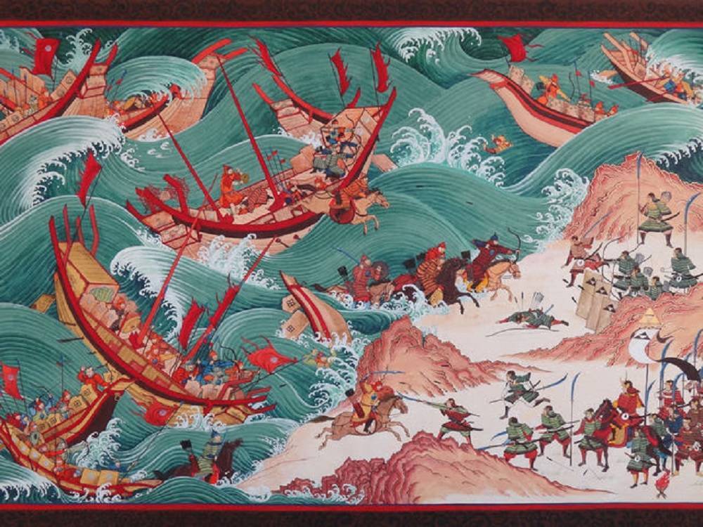 În perioada Kamakura, au loc două invazii mongole. Împăratul mongol Khubilai Khan stabilește dinastia Yuan (1279-1368) în China și cere Japoniei să plătească tribut, amenințând că va lua măsuri. Curtea imperială din Kyoto nu este obișnuită cu astfel de amenințări și invocă originea divină a Japoniei, respinge cererea mongolă și mesagerii coreeni și se pregătește de luptă. În 1274, are loc prima invazie mongolă. O armată formată din mongoli, chinezi și coreeni este trasportată în 600 de nave. Erau 23.000 de trupe înarmate cu arcuri și catapulte. Armata japoneză de la Hakata (nordul insulei Kyushu) s-a aparat împotriva invadatorilor care erau în număr mai mare. După o zi de luptă, un taifun a decimat navele mongole. În 1281, are loc a doua invazie mongolă. După șapte săptămâni de război în nord-vestul insulei Kyushu, un alt taifun a distrus flota mongolă. Preoții Shinto credeau că japonezii au învins mongolii cu ajutorul „vântului divin”(kamikaze). Cerul a protejat Japonia iar liderii au fost impresionați.