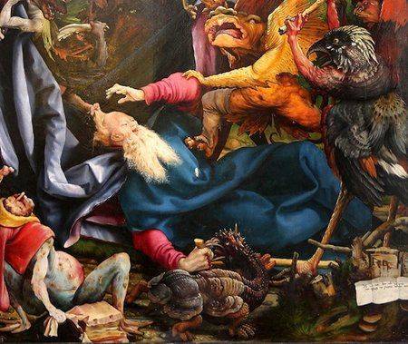 Artiștii medievali târzii au fost fascinați de povestea pustnicului creștin timpuriu Sfântul Antonie cel Mare, care a fost ispitit de diavoli. Pentru Grunewald, aceasta devine o teroare cu adevărat personală și psihologică, imaginea unui om a cărui sănătate este amenințată. Infinitele forme oribile ale demonilor sunt ca niște gânduri malformate. Este o lucrare plină de compasiune, deoarece aceasta face parte din retaula de la Isenheim, pictată pentru un spital care trata persoanele cu boli care desfigurau. Unul dintre diavoli are răni și pielea cenușie. Prin urmare, această scenă în care diavolii roiesc, ar putea reprezenta suferința fizică extremă care amenință sănătatea mintală. A influențat expresionismul german și este până în prezent o capodoperă a minții, pusă în pericol de forțe neînțelese.