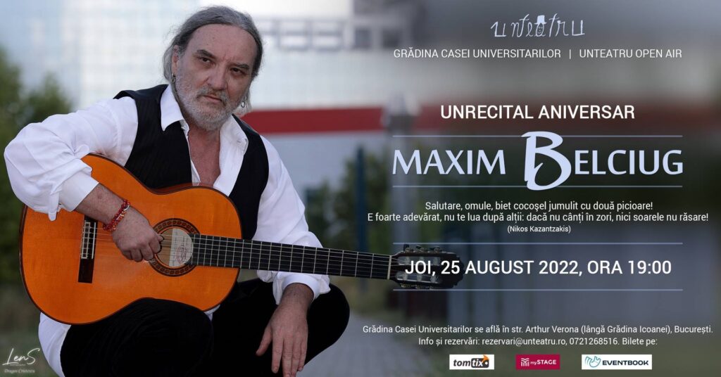 Joi, 25 august 2022, ora 19:00, stagiunea Unteatru Open Air își invită publicul la un concert aniversar: carismaticul Maxim Belciug își strânge în chitara sa iubită tot ce îi e mai frumos pe lume și vine în grădina Casei Universitarilor, să sărbătorească împreună cu publicul incredibilul fapt de-a fi împreună și de-a iubi muzica, și cerul albastru și lumea prin care ne trecem.