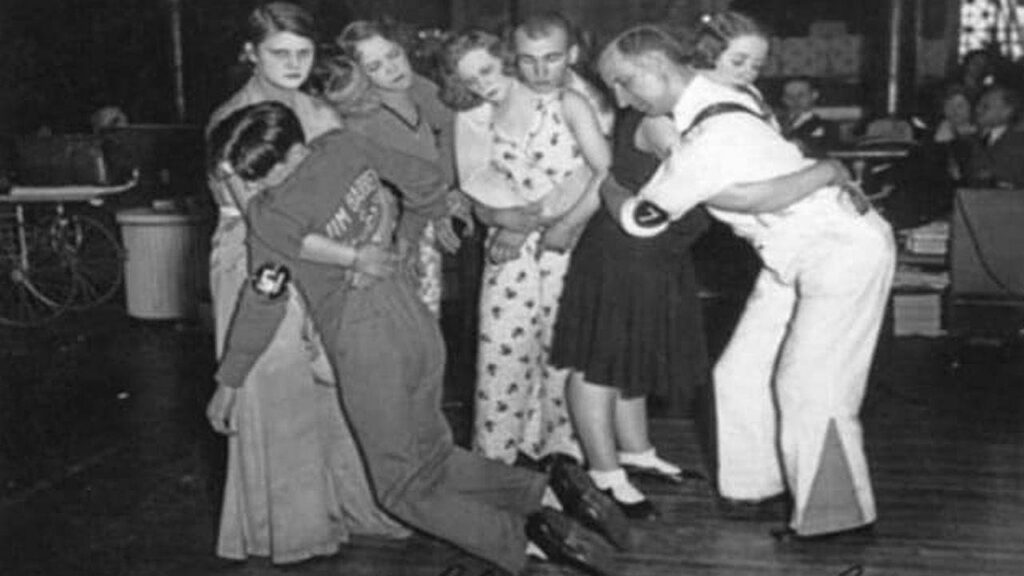 Erau evenimente de anduranță, în care cuplurile concurau între ele, cu premii pentru cuplul pe care îl țineau picioarele să danseze până toate celelalte abandonau. Această distracție ciudată a început în 1923, când o femeie pe nume Alma Cummings a schimbat șase parteneri, dansând timp de 27 de ore consecutive la Audubon Ballroom din New York City. Asta i-a inspirat pe alții, iar concursurile de maraton de dans s-au răspândit rapid în America, în timp ce concurenții încercau să doboare recordul lui Cummings.