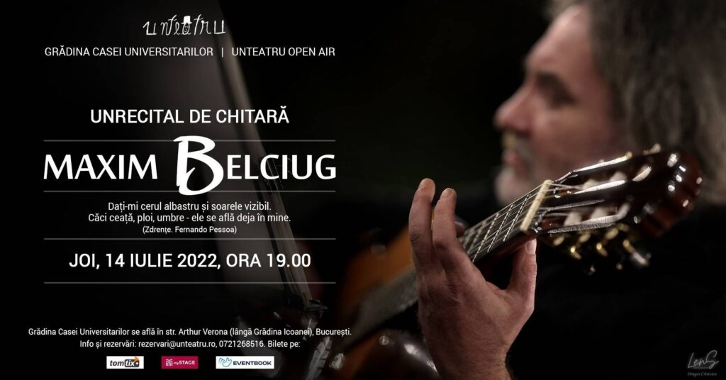 Joi, 14 iulie 2022, ora 19:00, carismaticul chitarist Maxim Belciug susține un recital de chitară în grădina Casei Universitarilor, în cadrul stagiunii Unteatru Open Air. Va fi, așa cum ne-a obișnuit protagonistul, unul dintre acele prilejuri în care chitara încetează să mai fie un simplu instrument și devine orchestră, izvor de culori, de freamăt, de nuanțe și emoții. Iar această orchestră poate cânta orice: baroc, și tango, poate-un Ceaikovski, o sonată, capricii, un fandango cu gust de colb în zbor de fuste, vreo fugă, vreun rondo ori chiar invențiuni scornite pe loc, la întrecere cu arta uitării.